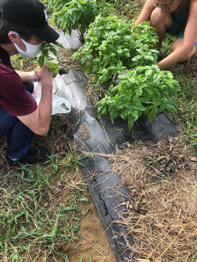 今回、ツル返しだけでは少し物足りない一部の参加者のため、畑で栽培している野菜を収穫することに。ナスやミニトマト、キュウリなどは、残念ながら暑さと水不足で収穫が終わってしまいましたが、猛暑に強いモロヘイヤ、空心菜、バジル、ツルムラサキなどは収穫することができました。