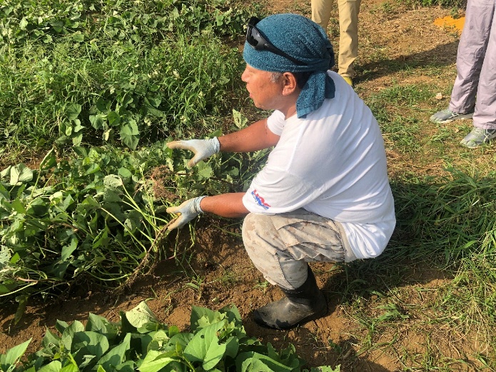 5月に植付けをしたサツマイモのツルがぐんぐん伸びてきたため、今回は「ツル返し」という作業を行いました。これは、伸びたツルの途中から出てくる根を引きはがし、ツル全体をひっくり返す作業です。