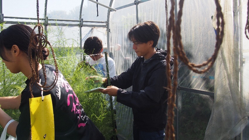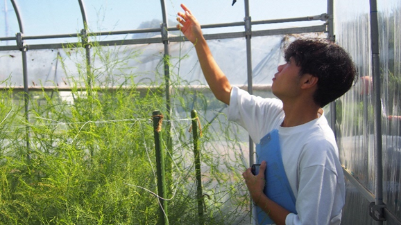 まず、ビニールハウスで栽培中のアスパラガスの様子を確認します。