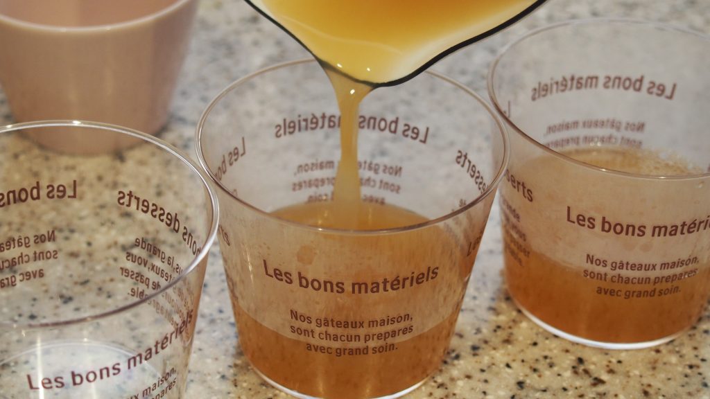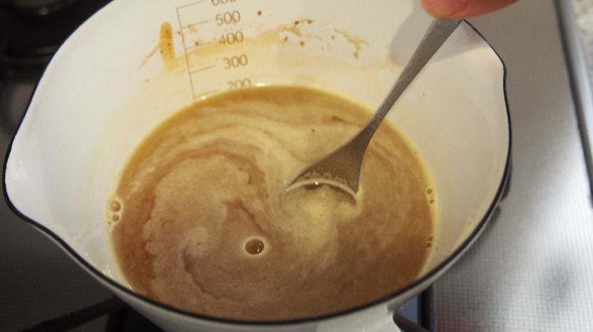 甜菜糖(てんさいとう)を使用しているので少し濁った味噌汁のような色に見えますが、グラニュー糖を使えばもっと透明感のあるオレンジ色になります。